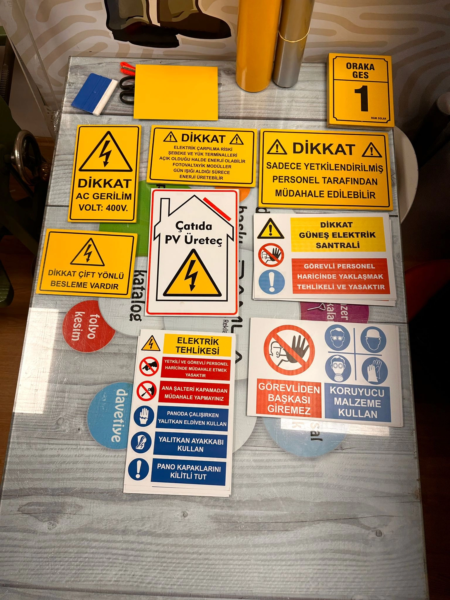 Dayanıklı ve dış ortama uygun malzemelerden üretilen GES uyarı levhaları, güneş enerji santrallerinin çeşitli noktalarında kullanılır. Elektrik panoları, trafo alanları, kablo geçişleri, yüksek gerilim hatları ve bakım alanlarında yer alır. Bu levhalar, net ve görünür mesajlar ile güvenlik seviyesini artırır, tesislerin güvenli ve mevzuata uygun şekilde işletilmesine katkıda bulunur.